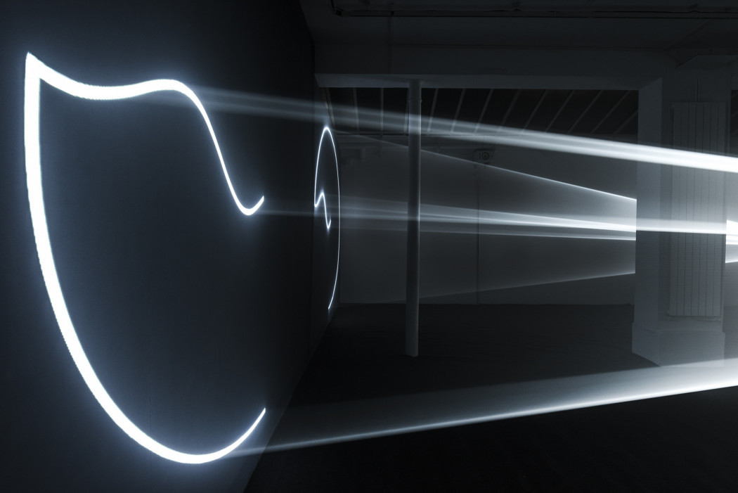 Anthony McCall drew inspiration from both the visual arts and cinema to create his first “solid-light” film, Line Describing a Cone, in 1973, in which a volumetric form of light materialized by mist moves slowly through three-dimensional space. When Anthony McCall’s works are projected in a dark room, without chairs or screens, they become luminous forms like ‘light sculptures’: a moving drawing on the wall, and a volumetric form in the space materialized by the mist. Oscillating between sculpture, drawing and video, his work offers the viewer both a physical and a visual experience. Anthony McCall is represented by Galerie Martine Aboucaya, Paris France, and Thomas Zander Gallery, Cologne Germany.