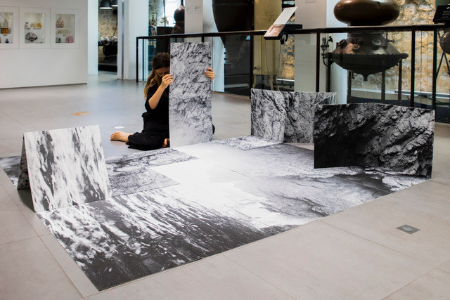In her artistic practice, Arina Essipowitsch explores notions of identity and displacement determined by her biography. The artist reappropriates photography through a particular visual language: she enlarges, folds and transforms the image, breaking it down into several modules that are stretched out in space to build veritable three-dimensional objects. These fragments of a single piece combine to form an infinite number of new images, extending the viewer’s visual experience. These portable images stem from the artist’s sensitive relationship with the territories she travels through, and become traces of her own history, like a family album. During her performances, Arina literally plunges us into the moving photographic material, having fun blurring all reference points of scale and space to encourage us to break the boundaries of the image and look differently.