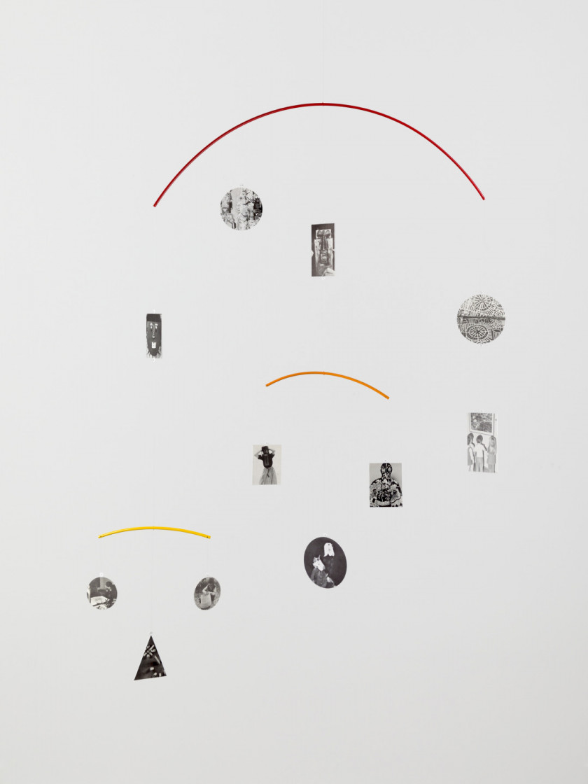 Carmen Winant’s photographic work employs strategies of collage and installation to embrace forms of making associated with craft: a category of creating that has been historically relegated to a status below art with a capital “A.” For her presentation at OFFSCREEN, Winant expands on her series The Making and Unmaking of the World which comprises mobiles and framed collages that incorporate photographs cut out from 1970s instructional books on the subjects of craft (e.g., pottery, mask-making, weaving, puppetry, and basketry). Also included in the presentation is a wall-sized, site-responsive installation The Actual World (2021), a constellation of the book pages that were used to create the mobile pieces. Winant’s photographic mobiles mark the first time within the artist’s practice that installations have “left the wall.” These instructional images become kinetic drawings in space as the colorful armatures from which the images are suspended recall the thin and yet bold line found in a Kandinsky painting. Each composition transforms into visual poems of instruction. To untether the images from their original context is a gesture that aims to reimagine them and their potential as objects.