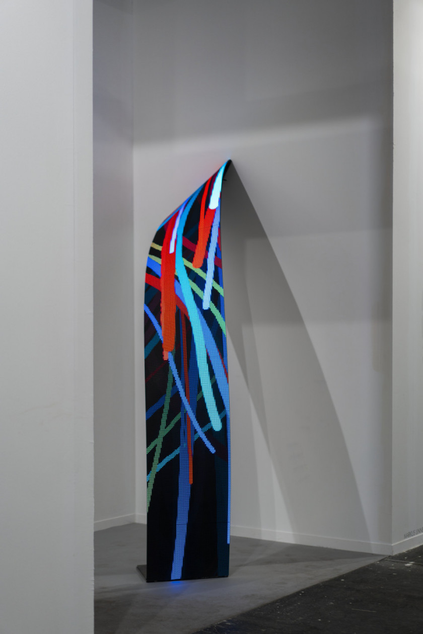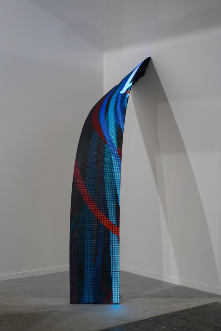 The artworks are ribbon-shaped LED-screens that emerge from the wall with curving gestures and then descend to the floor. The screens become conduits of data related to real-time meteorological information of the city of Paris, including wind speed, temperature, barometric pressure and humidity. The flow of information is represented via particles that leave trails behind them, creating abstract forms that take the pulse of the city’s activities.