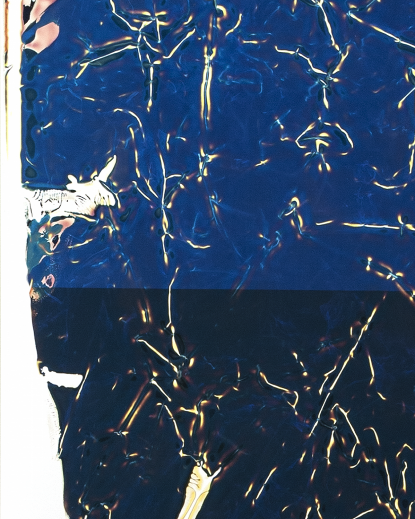 To the question “What is a 21st century photograph?”, Carey answers by partnering the 19th century photogram with 20th century Polaroid’s instant technology. “What do these two have in common?” Her answer: the negative! Crush & Pull thus combines Polaroid and photogram using the Polaroid negative to create new abstract forms and blended hues with experimental approaches and innovative process-driven methods located in chemistry-laden Polaroid “pods” and the “light-tight” color darkroom.