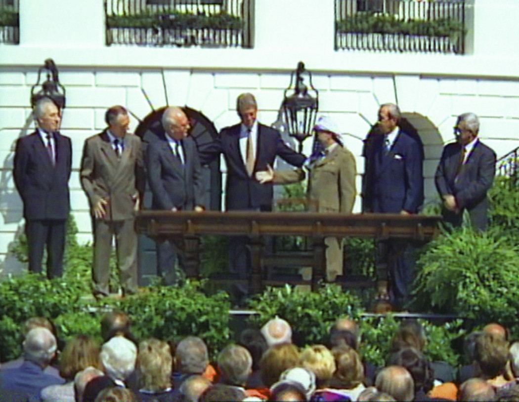 Jonas Englert’s work reflects social-philosophical phenomena and both political as well as historical narratives and materials through video, diagram, text, and sound. “Declaration of Principles” (2022) reflects the pictorial referentiality of the iconic scene performed by Yasser Arafat, Bill Clinton and Yitzhak Rabin in the course of the Declaration of Principles on Interim Self-Government Arrangements on September 13, 1993 in Washington, D.C. Using both moving and static found footage, the work recontextualizes this political staging in an altar-like polyptych, draws connections, both evident and obscured, and deconstructs the pictorial authenticity of the event. By interrogating the iconography and rhetoric that makes a scene historic, Declaration of Principles questions the singularity and originality not just of this specific scene, but of the image in general.