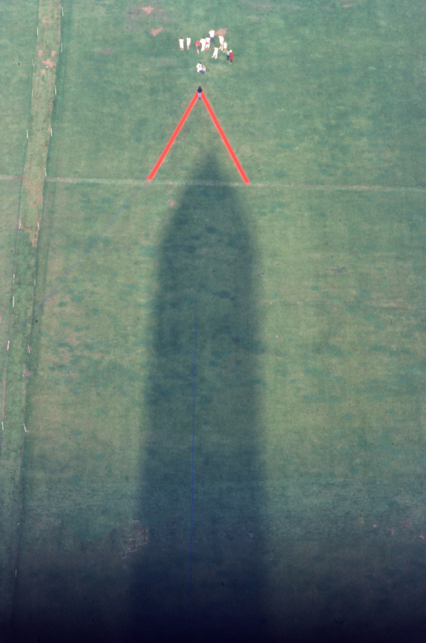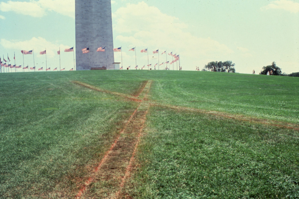 To create the site-specific work, Albuquerque dug triangular trenches into the earth due West, North and East of the Washington Monument obelisk. She consulted the astrophysicist, Donald Goldsmith for his calculations to geolocate the precise times and locations for the intersections, so that her earth installation would be in perfect alignment with the shadow of the massive structure. She filled the trenches with natural pigment, in a technique she had already begun to use in her landworks in locations including the Mojave desert and the Malibu horizon line, which was recently reconstructed this year.