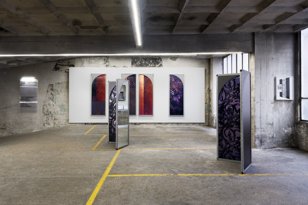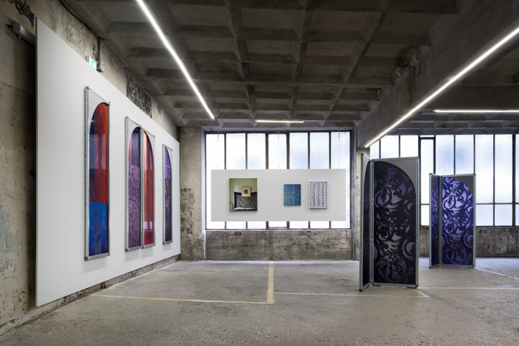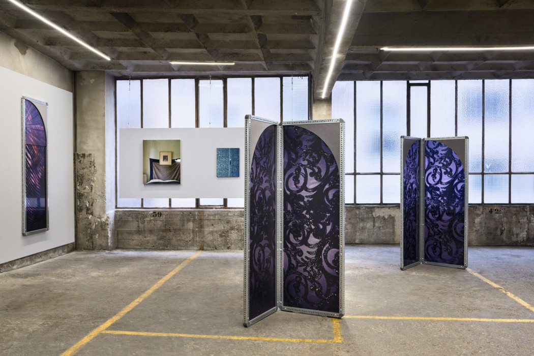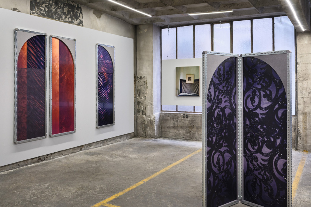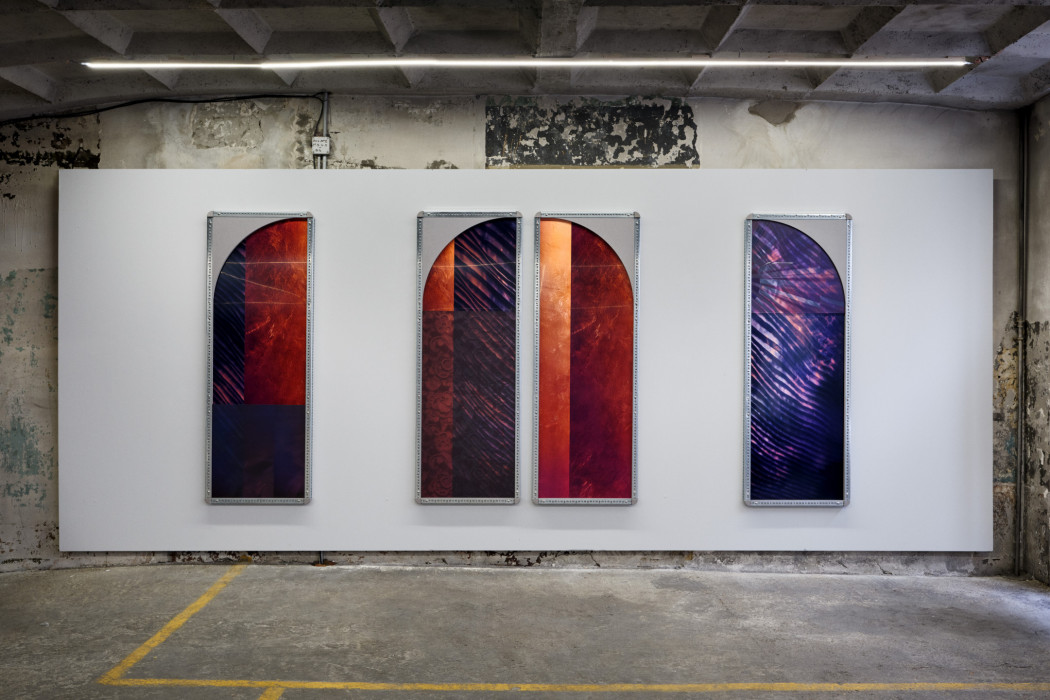 In Sara VanDerBeek’s “Lace Interlace” (2023, 2024) works, images of handmade and industrially produced textiles, and fragments of contemporary and historical costumes are layered and presented in custom designed frames made of lace-like perforated steel. The arrangement and layering of images, printed via advanced UV and Dye Sublimation processes, is inspired by the arrayed and accumulative organization of early photographic albums by Julia Margaret Cameron, Anna Atkins and Isabel Agnes Cowper that VanDerBeek has researched and captured over the course of her multi-year development of the project. The tint and toning of 19th century albumen prints influenced VanDerBeek’s overall palette of mauves, coppers, and grisaille.