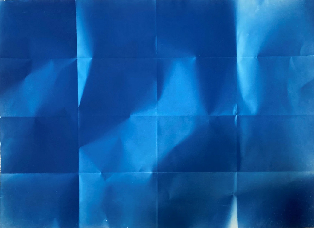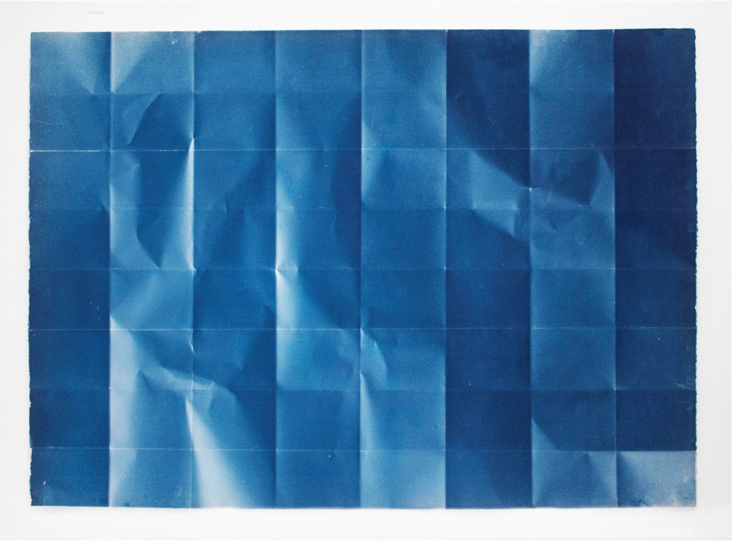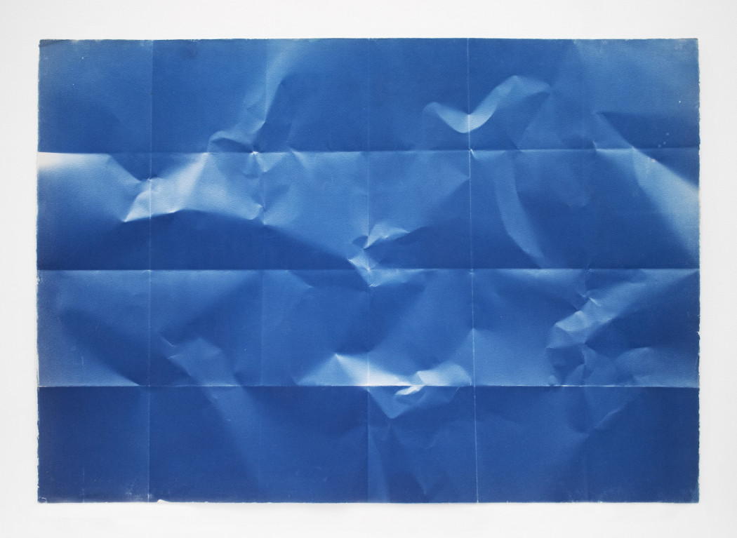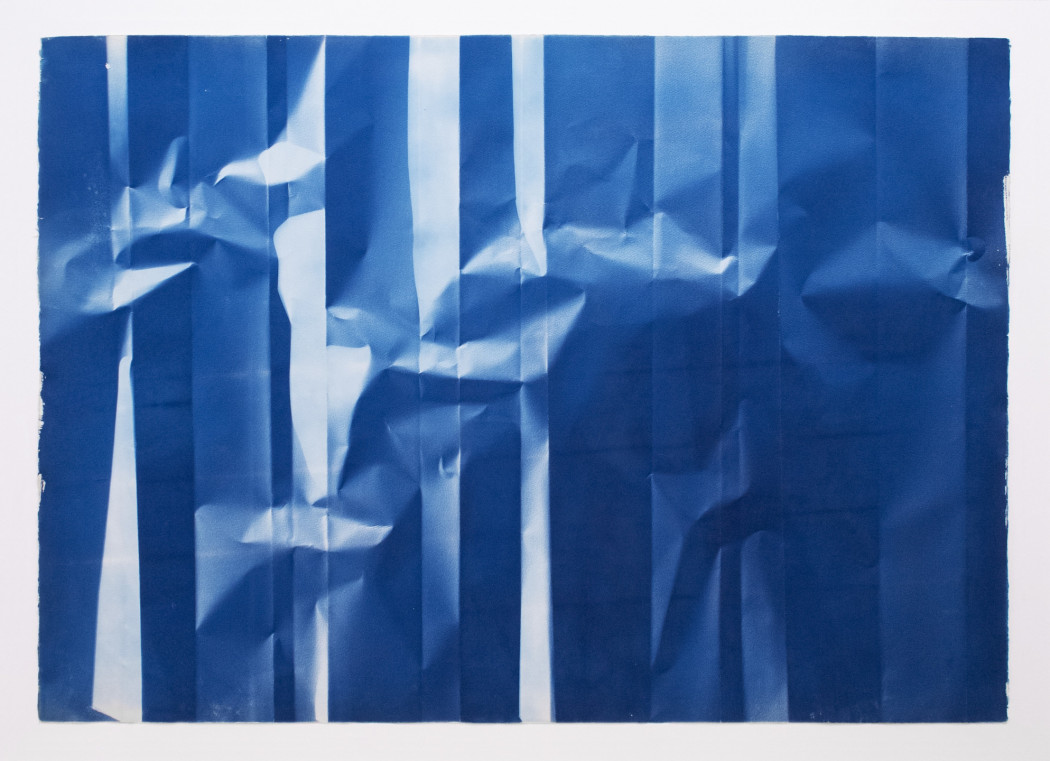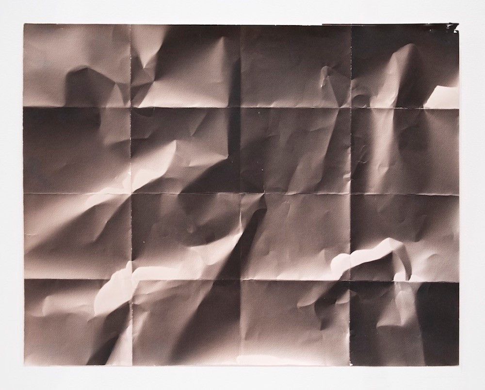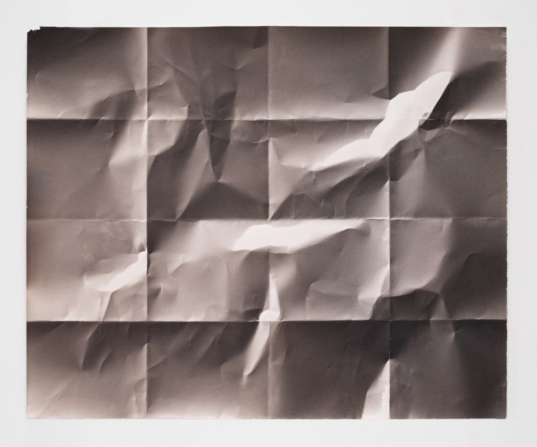 The Pinkelgraphs on view are early phenomenological light experiments that Pinkel began after discussions with a physicist spurred her to think of light as a substance with which to paint. Here, in her series Folded Paper (1974 – 1982), Pinkel has distilled her process down to a sheet of photographic paper and a single source of light. In the darkroom she crushes and folds the paper to create a sculpture, then turns on a one-point light source that exposes the paper at different rates depending on the angle of contact. The sculptural form is then flattened and processed and the image appears, also documenting Pinkel’s physicality. The artist describes each session in the darkroom as an adventure and a discovery, with new mysterious images—seemingly latent and embedded in the paper—being pulled out through her hands. Each of the Pinkelgraphs is a series of paradoxes despite the economy of its making—a two-dimensional image of a three-dimensional volume and an abstraction of its own past form—described entirely by light and born of itself.