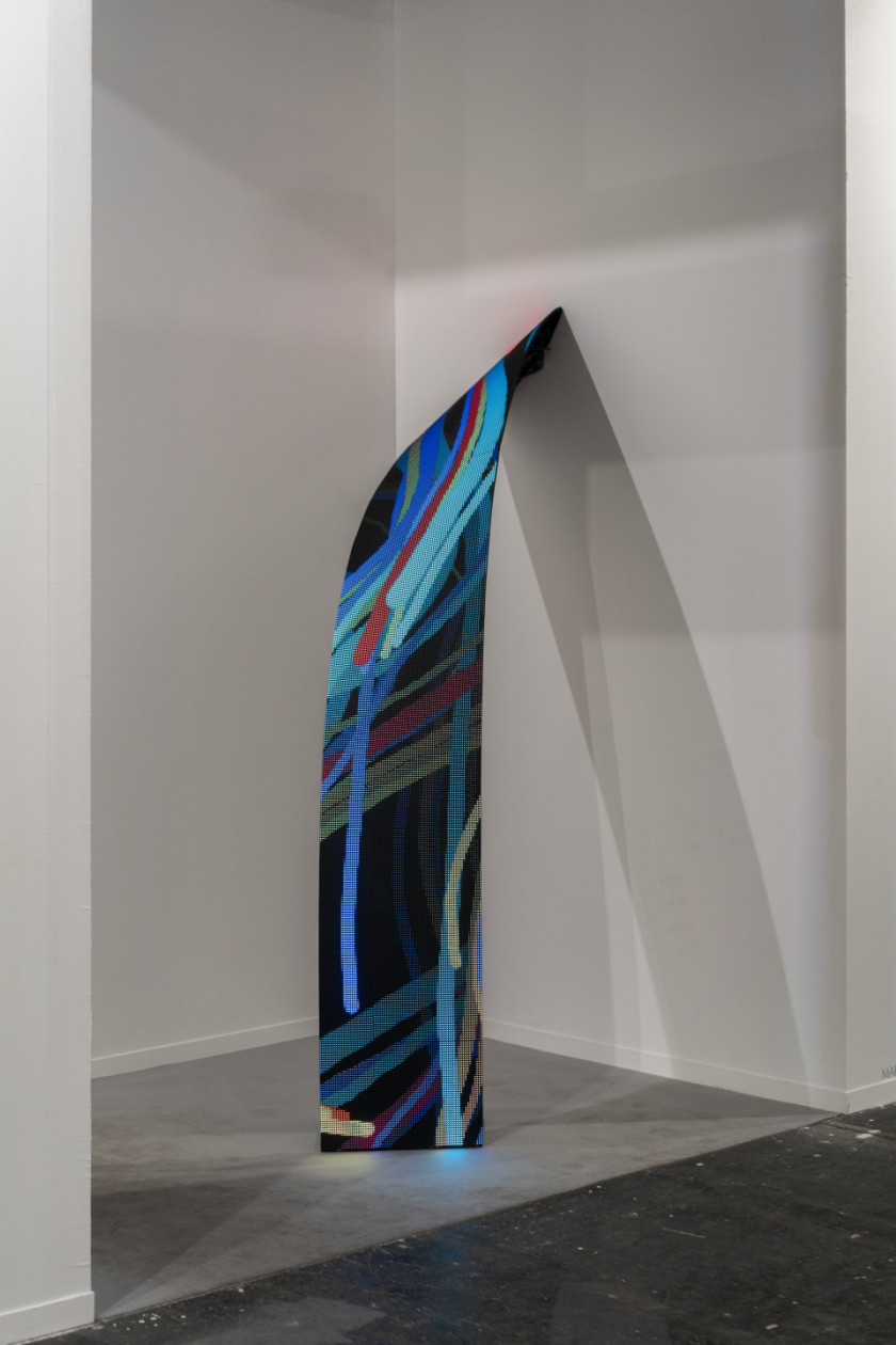 Les œuvres d’art sont des écrans LED en forme de ruban qui émergent du mur avec des gestes courbes et descendent ensuite jusqu’au sol. Les écrans deviennent des conduits de données liées aux informations météorologiques en temps réel de la ville de Paris, y compris la vitesse du vent, la température, la pression barométrique et l’humidité. Le flux d’informations est représenté par des particules qui laissent des traces derrière elles, créant des formes abstraites qui prennent le pouls des activités de la ville.